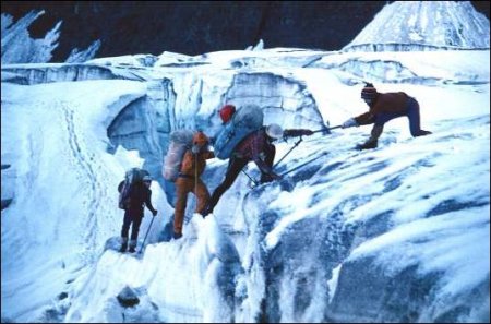 Помните: связка не всегда способна эффективно удержать при падении в трещину. Ее действия обычно неэффективны при срыве более одного участника, при нежестком закреплении участников на связочной веревке, при срыве участника, находящегося ниже по склону, как в описанном случае: один сдернул двух. А также при срыве на открытом льду, на крутых слонах, при срывах с большой слабиной веревки на большую глубину и т. п. Реально оценивайте возможности связки и в рискованные моменты вовремя изменяйте технику: применяйте попеременную страховку и перила, искусственные точки опоры (ИТО: ледобуры, ледоруб в уплотненном снегу)… В общем, любой технический прием, даже с виду достаточно простой, еще не освобождает от необходимости думать и принимать решения, исходя из конкретной обстановки, особенностей рельефа, опыта, подготовленности участников и снаряжения…