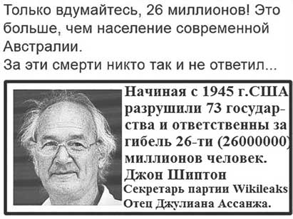 26 миллионов погибших, – это примерно столько, сколько СССР потерял во Второй мировой войне от нацистской Германии (А Китая – от Японии). Это больше, чем официальные потери Первой мировой войны! Какие страны наносили человечеству такие потери? Только нацистская Германия, милитаристская Япония и… «демократичные США». Это сказал секретарь партии WikiLeaks в Австралии Джон Шиптон