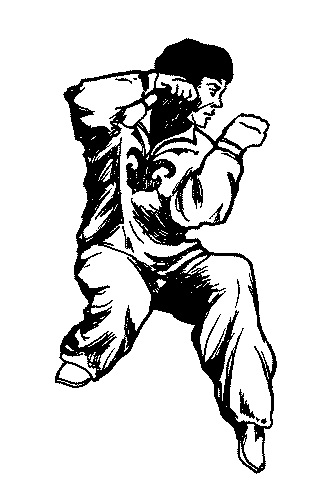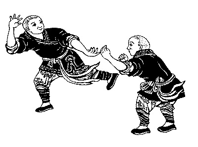 15. «Золотой петух клюет пищу» – скручиваясь в пояснице и перекрещивая обе ноги, боец подхватывает одной рукой снизу ногу противника и одновременно другой рукой наносит удар противнику в пах.