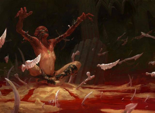 Кости, усеивающие пол пещеры, начинают дрожать. Повинуясь его движениям, они взмывают в воздух, а из крови, обильно разлитой вокруг врага, выныривают белёсые кинжалы и грубые самодельные мечи.