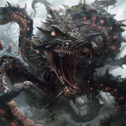 Змееподобное тело покрыто крепкими наростами. Десятки лап с каждой стороны вспарывают землю. Уродливая морда усеяна множеством глаз. Вытянутая пасть беспрестанно клацает, создавая неприятный оглушающий шум. Чудовище не лезет к лагерю, держась на расстоянии – за первой линией деревьев.