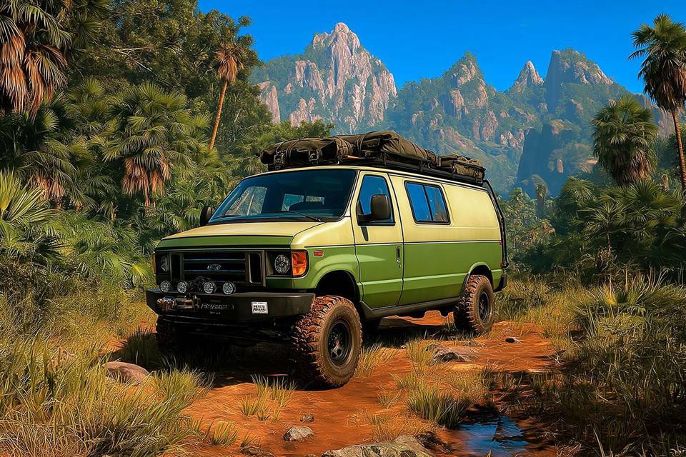 Наконец, мы выехали на небольшую поляну, где в тени под пальмами стояло две машины. Первая – стандартный фургон Датча, а второй – мой. По первому впечатлению это был минивен. Он же малотоннажный фургон производства компании Ford. По второму – что-то типа Ford Econoline E350.