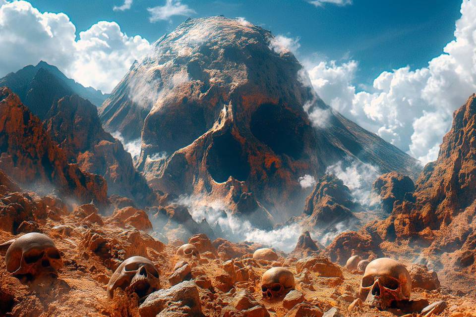 Пар был и на той горе, и когда плотную завесу подвинуло дымом, я понял, что это не просто пещеры. Это тоже был череп. Точнее, гора выглядела как череп. Скруглённая вершина, два круглых провала, похожих на глаза, и между ними дырявая перемычка, вполне тянувшая на носовую впадину.