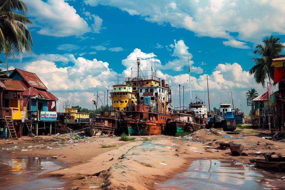 Но не получился. Не было ни забора, ни блокпостов с охраной. Посередине дороги, плотненько приткнувшись, лежали три ржавые баржи, по бокам фазенды бедняков, а за баржами что-то уже покрупнее, что послужило фундаментом, поверх которого уже наварили несколько этажей. Подозреваю, что снятых с других лодок.