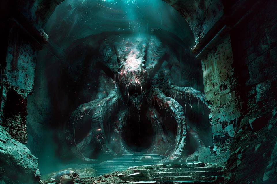 Хотя не будто, а именно каменные. Стоило подойти ближе, как стало понятно, что это тоже скульптура, обрамляющая проход куда-то в очередной коридор. Суммарно вся конструкция тянула метров на пять, а к самому полукруглому проходу, расположенному между щупальцами, вели ступеньки.