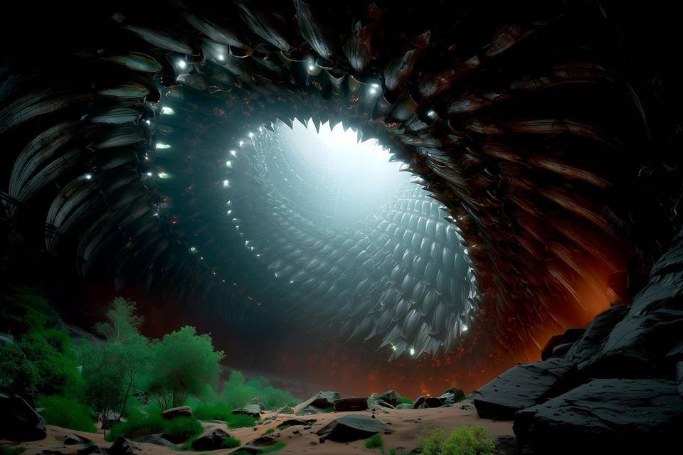 Мы прошли ещё немного вперёд, выбираясь из прохода и открывая всё более обширный вид на новый зал. Над нами нависал круглый потолок с огромным отверстием в центре, через которое падал солнечный свет. Сами стены были собраны из очень непонятного материала, да и сама форма стен вызывала много вопросов. Крупные овальные листы, наложенные друг на друга и похожие то ли на гигантскую змеиную чешую, то ли плотно впихнутые в подсолнух семечки.