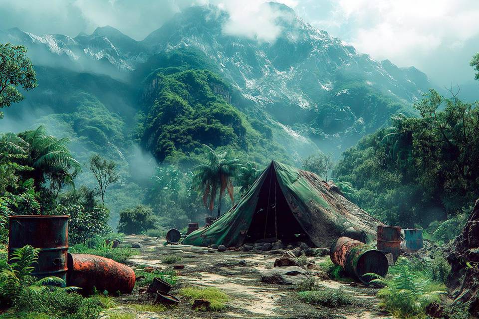 В принципе нам палатка такая большая была не нужна. Итого уже два варианта для носилок, а если с бочками считать, то целых три. Было из чего выбрать. Неподалёку нашлась и пальма, листьями которой можно было и дыры заделать, и на волокна разобрать, плюс коры вокруг было полно.