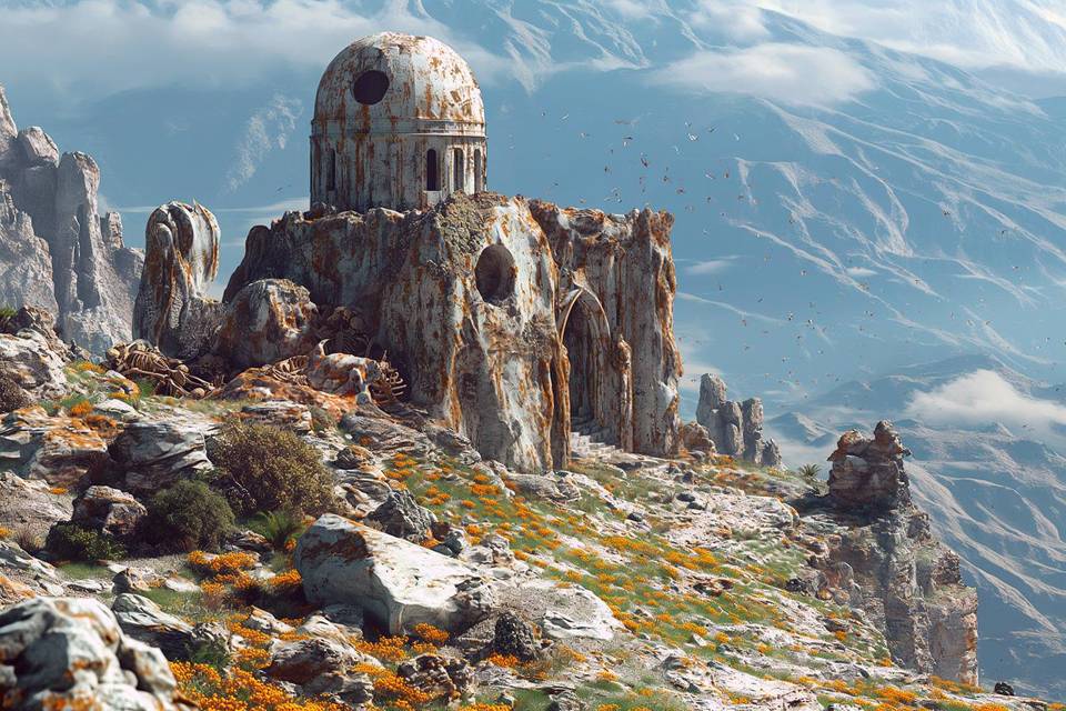 Верхушку здания «Древних» я заметил издалека. Появилась над камнями какая-то «шишка», выглядевшая, как непонятно что, но точно инородное и древнее. Какой-то белый купол с трещинами, сколами и здоровенной дырой, вокруг которых вились какие-то рыжие потёки и пятна.