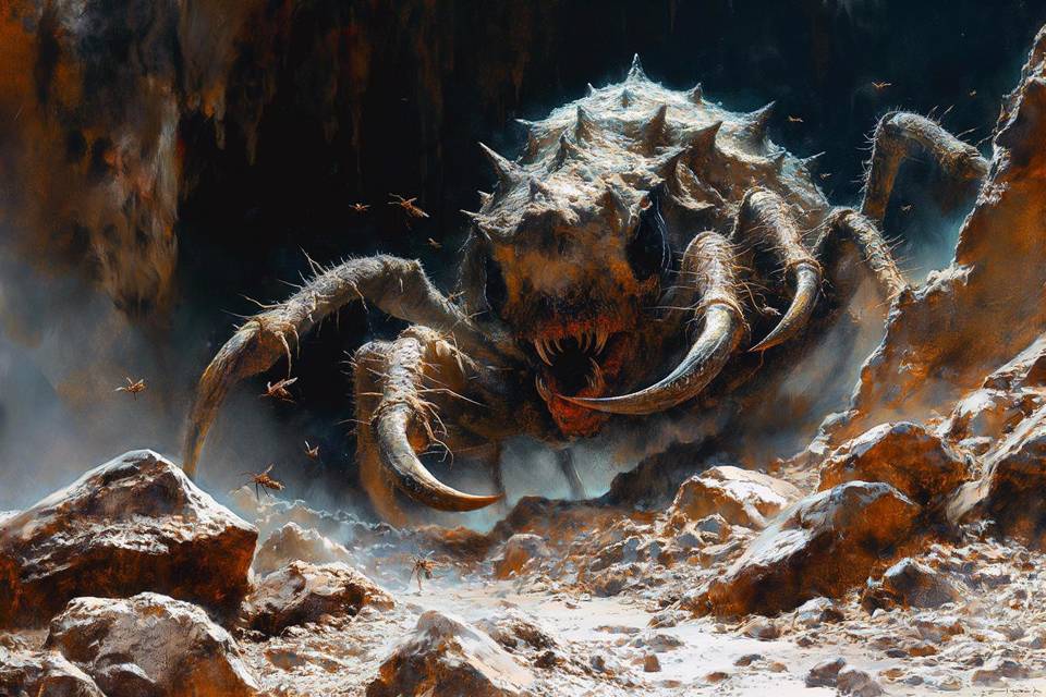 Я не заметил движения, он просто оказался между мной и проходом. Толстая, приземистая хрень с десятком лап. Копия и мелких летунов и средних монстров, наполненных токсинов, просто возведённая в абсолют. Треугольная морда с пастью, состоящей только из клыков – жевать там никто не собирался, только рвать и проглатывать. По бокам две чёрные зоны, предположительно органы зрения, но для обычных глаз они были слишком затянуты какой-то шершавой, плотной плёнкой. Похоже, старый, вот сам и не видит уже.