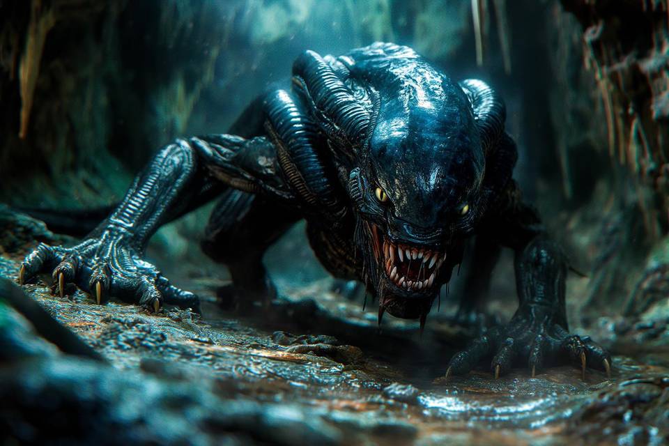 Что уж греха таить, я проникся. Примерно так мог бы выглядеть плотненький карлик, не прошедший из-за роста кастинг на роль «Чужого» в одноимённом фильме. Гладкий, длинный череп, этакой лоснящейся пиявкой плавно перетекающий в спину, а затем и в хвост. Какие-то хитиновые трубки, сами по себе похожие на червяков, выступали из головы монстра и также уходили вдоль хребта и прятались где-то в основании хвоста. Пасть большая, с кривыми острыми клыками – но этим меня на Аркадии уже сложно было удивить. А вот два дополнительных клыка, торчащих из подбородка, были уже в новинку. Возможно, ими он и пробивал черепа для последующей закладки яиц. Четыре мускулистых лапы, все с когтями, на которых держалось метровое тело, плюс хвост ещё метра на полтора. Но в этом я уверен не был – хвостик терялся где-то среди камней.