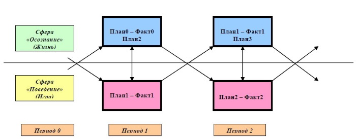 На наш взгляд, этот следующий шаг уже терминологически предполагает раздвоение единого процесса на два самостоятельных, алгоритмически равнозначных, процесса. Они могут быть названы так: ОСОЗНАНИЕ (включающее планирование) и собственно ПОВЕДЕНИЕ по плану.