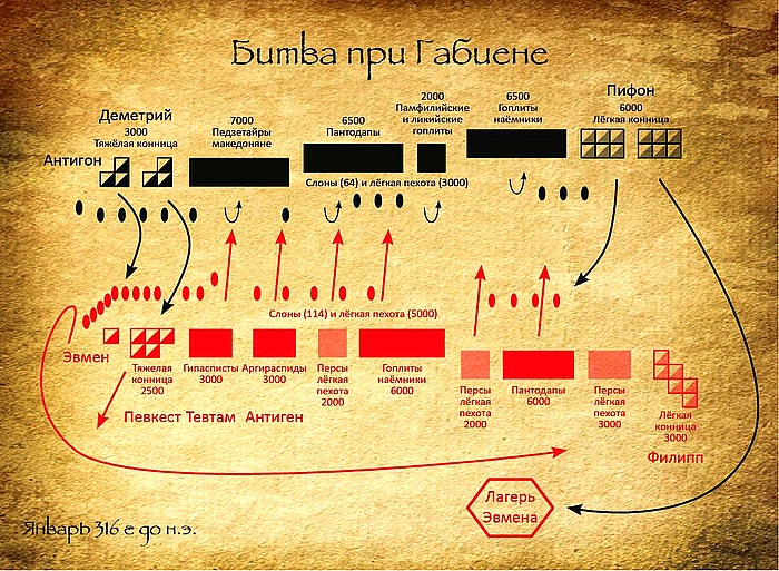 Отчаянно нуждаясь в продовольствии для многотысячного войска, Антигон решился на рискованный переход через пустыню. Ему почти удалось застать Эвмена и сатрапов врасплох. Узнав о его приближении, они не успевали собрать свои силы. Но кардиец смог избежать и этой ловушки, он обманул разведчиков Антигона, подставил им в ночи ложный лагерь и выиграл время. Он и битву почти выиграл. Последнюю свою битву…