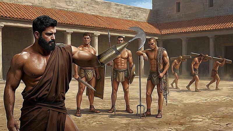 Палемон тоже взял скутум и повторил позу германца, не давая Целеру приблизиться, смещаясь влево-вправо. Как «фракиец» ни танцевал перед ним, подойти для укола не смог. Тогда он попытался пройти низом, намереваясь подрезать выставленную вперёд левую ногу наставника. Но каким бы стремительным не был рывок Целера, Палемон оказался быстрее. Его скутум рухнул вниз, прикрывая ногу, а меч скользнул по шее гладиатора.