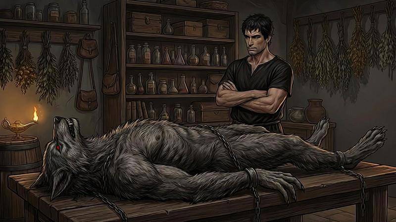 Страммила пришёл в себя, открыл глаза. Задёргался, забился в кандалах, и горбун применил хитрую удавку. Ликантроп захрипел и начал рваться сильнее. Ликимний загодя подготовил его, срезал шкуру в верхней части груди. Рана зарубцевалась на глазах, но волосы не проросли. Теперь там лежали монеты и жгли оборотня, словно раскалённое железо.