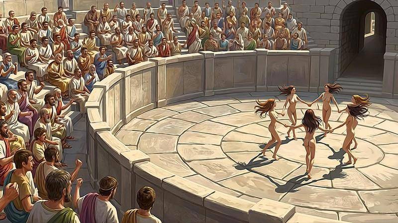 На орхестру из правого парода вышла, грациозно ступая, высокая женщина, закутанная в необычное одеяние из множества шафрановых лент. На голове её сверкала золотая диадема, а в руке женщина держала лук со снятой тетивой. Вокруг женщины завертелся хоровод из двух десятков обнажённых девушек с распущенными волосами.