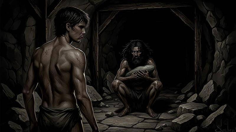 Рыжий огонёк выхватывал из чернильной тьмы неровные стены. Под ногами копошилось многорукое и многоногое чудовище. Голые тела, согнутые потные спины. По ним катилась волна, сопровождаемая скрипом корзин с породой. Они нескончаемой вереницей ползли из сердца тьмы к выходу. Где-то там, в глубине сталь лязгала о камень. Ей вторил звон цепей. Жуткая музыка.