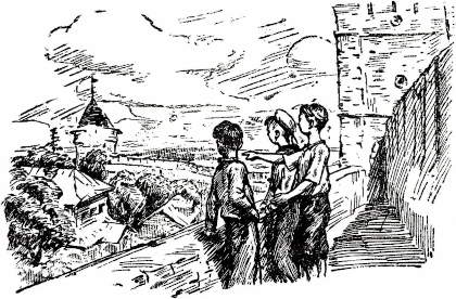 По ветхой галлерее мальчики добрались до высокой башни, поднялись по замшелой, почти отвесной лестнице на верхний ее ярус, откуда в узкую бойницу можно было хорошо разглядеть окрестности.