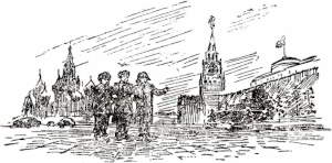 Друзья выходят на просторы Красной площади. Чуть покачиваются голубые ели у величественных кремлевских стен. Гулко разносится бой курантов. Весь, словно в кружевах, стоит храм Василия Блаженного.