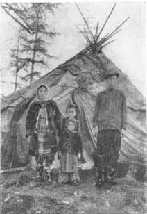 Харитон и его семья у входа в свою сделанную из оленьих шкур юрту