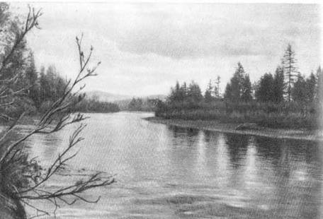 Перед устьемТашепы наша флотилия прошла мимо невысоких, но очень красивых обрывов слоистого песчаника, у подножия которых медленно скользила спокойная масса воды. Скалы ощетинились редкими верхушками лиственниц и темно-зелеными кустами кедрового стланика. Ниже по долине Анюя это типичное для бассейна Колымы растение еще нигде не встречалось; однако дальше вплоть до вулкана стланик сделался одним из важных элементов ландшафта.