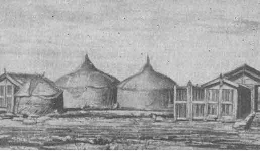 Юрта, в котором, по словам монголов, хранились останки Чингис-хана, ордосская святыня Ихи-Эджен-Хоро – Великая ставка Владыки, стояла за болотистым лужком речки Чжам-Хак, между двумя песчаными барханами. В нарядном китайском платье, сопровождаемый двумя, монголами, Григорий Николаевич пешком отправился к Ихи-Эджен-Хоро. Вот и сама святыня. На невысокой четырехугольной насыпи, облицованной кирпичами, за проломленной деревянной оградой впритык стояли две юрты, и там, где они соприкасались, был устроен тайный проход. На юртах золотые маковки, верхние войлоки, покрывающие своды юрт, вырезаны по нижней кромке фестонами в виде языков, свисающих вниз. Вместе с монголами Григорий Николаевич трижды поклонился, встав перед растворенными дверями юрты. Входить в юрту не разрешалось. Только из темных дверей неожиданно высунулась рука с красным деревянным блюдом, на котором стояла медная вазочка с горевшим маслом. Монголы-дархаты[6], хранители юрты, сопровождавшие Потанина, предложили ему взять блюдо и подержать его. Затем все снова троекратно поклонились юрте и удалились.
