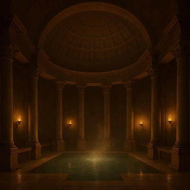 Ого, приятный сюрприз! За тяжёлой резной дверью скрывались настоящие римские термы. От вырезанного в белоснежном мраморе бассейна, наполненного кристально чистой водой, поднималось лёгкое облако пара. В воздухе витали приятные запахи ароматических масел: лаванды, оливы и корицы, смешанных с обработанной кожей и свежей древесиной. Свечи под стеклянными колпаками создавали уютный полумрак. Играла тихая расслабляющая музыка.
