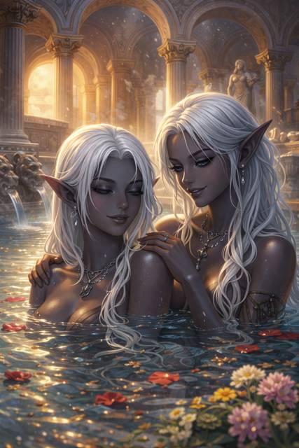 Опустившись в воду, поманил к себе радостно хихикающих девушек, пока пальцы беззвучно опустившейся на колени Зирии массировали мои плечи. Ламирия расслабляюще пела, а мы с Рокси и Айанэ с большим энтузиазмом изучали их новые тела.