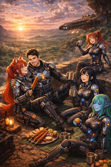 С удовольствием принял приглашение и впился зубами в нежное мясо. Айанэ тут же подала космический огурец и стало вообще хорошо. Алый закат на горизонте послужил прекрасным штрихом в удивительно мирной идиллической картине. Мы наслаждались жизнью на крыше артиллерийской установки, отправившей на тот свет тысячи гигантских жуков, и отлично себя чувствовали.