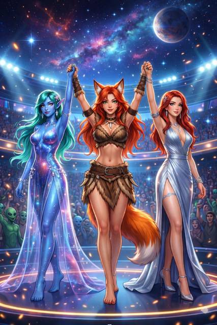 Картина настолько ярко предстала перед глазами, что я не сразу заметил произошедшие изменения. Девушки снова исчезли и появились посреди космической сцены, победно вскинув руки. Петух неподалёку кудахтал об их достижении, а я совершенно потерял дар речи от их красоты и вновь изменившихся нарядов.