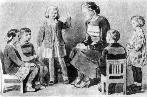 Ваня разделся, поднялся во второй этаж и вошёл в большую светлую комнату. Там вокруг Лидии Николаевны на низеньких стульях уже сидели Мая Орлова, Лёва Дорошенко, Вася Максимов, Лиза Кудряшова, Петя Захаров.