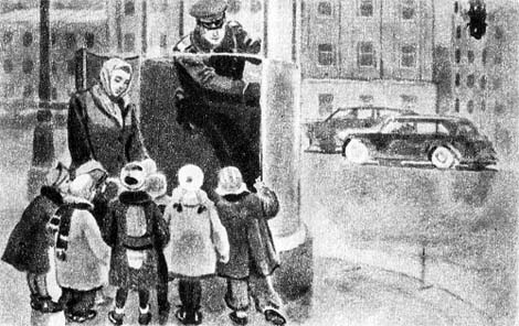В двух нижних рядах военных картинок было поменьше. Тут яркокрасные трамваи бежали по городским улицам. Мчались по шоссе «Победы», «Москвичи», пятитонные грузовики. Поезда неслись по рельсам. Праздничные шествия двигались с красными знамёнами мимо трибун.
