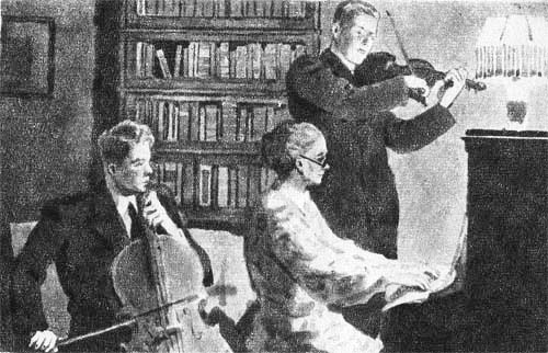 Иногда скрипка рассказывала что-то, всё рассказывала, а остальные ей помогали, поддерживали её; иногда начинала говорить самое главное виолончель, потом пианино, а потом все трое хором опять всё рассказывали что-то, всё рассказывали…