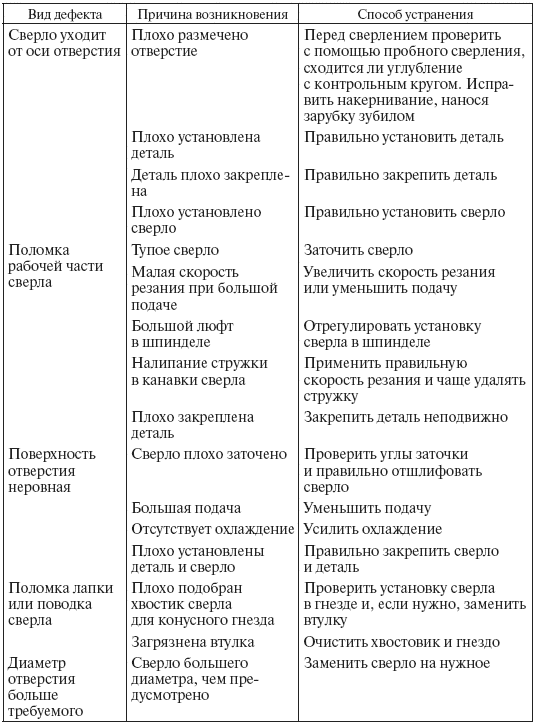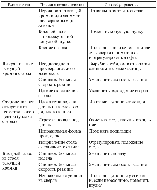 В процессе сверления могут иметь место различные дефекты: поломка сверла, выкрашивание режущих кромок, отклонение сверла от оси отверстия и т. д.