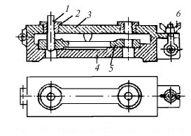 Рис. 22. Приспособление с кондукторной плитой для сверления: 1 – сверло; 2 – втулка; 3 – кондукторная плита; 4 – нижняя часть кондуктора; 5 – обрабатываемая деталь; 6– винт с гайкой-барашком