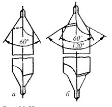 Центровочным сверлом называют инструмент, используемый для выполнения центровых отверстий в торцевых поверхностях валов. Различают два вида центровочных сверл: для обычных центровых отверстий без предохранительного конуса и для центровых отверстий с предохранительным конусом (рис. 23). Нормализованным углом обычного центровочного сверла является 60°, а сверла с предохранительным конусом – 60 и 120°.