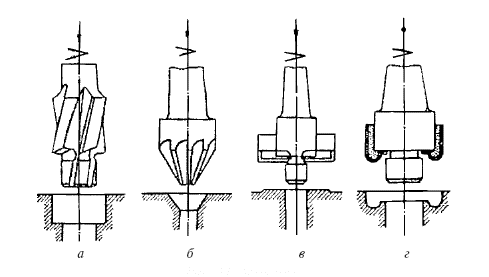 а – цилиндрические для зенкерования сквозных или глубоких отверстий; б – конические для снятия фасок и образования конических углублений; в – торцевые для зенкерования торцевых поверхностей приливов (торцовки); г – фасонные для зенкерования фасонных поверхностей