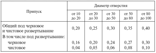 Развертывание дает окончательный размер отверстия, требуемый по чертежу. Диаметр отверстия под развертывание должен быть меньше окончательного на величину припуска на развертывание (табл. 10).