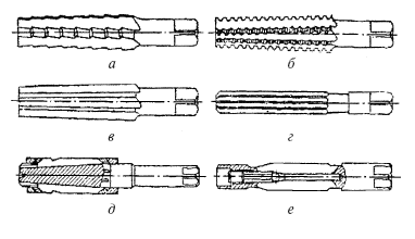 Различают следующие виды разверток: по способу использования – ручные и машинные, по форме – с цилиндрической или конической рабочей частью, по точности обработки – черновые и чистовые, по конструкции – с цилиндрическим хвостовиком, с коническим (конус Морзе) хвостовиком и насадные. Насадные развертки могут быть цельными, со вставными ножами и плавающие. Ручные развертки могут быть цельными и разжимными. Развертки могут иметь простые и винтовые зубья. На рис. 25 представлены ручные развертки.