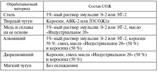 СОЖ применяются при всех видах обработки металла резанием. Хорошая СОЖ не вызывает корродирования инструмента, приспособления и детали, не оказывает вредного влияния на кожу человека, не имеет неприятного запаха и хорошо отводит тепло. При сверлении отверстий в стали используется водный раствор мыла, 5 %-ный раствор эмульсии Э-2 или ЭТ-2; при сверлении в алюминии – 5 %-ный раствор эмульсии Э-2, ЭТ-2 или жидкость следующего состава: масло «Индустриальное» – 50 %, керосин – 50 %. При сверлении мелких отверстий в чугуне СОЖ не используют. При сверлении в чугуне глубоких отверстий используется сжатый воздух или 1,5 %-ный раствор эмульсии Э-2 или ЭТ-2. При сверлении меди и сплавов на ее основе применяется 5 %-ный раствор эмульсии Э-2, ЭТ-2 или масло «Индустриальное».