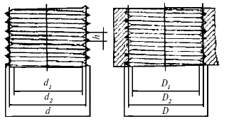 В резьбе различают номинальный диаметр резьбы, который чаще всего является наружным диаметром винтовой поверхности d, внутренний диаметр d1, средний диаметр d2 винта и внутренний диаметр отверстия гайки D1, диаметр резьбы гайки D, средний диаметр резьбы гайки D2 чаще всего равный d2 (рис. 28).