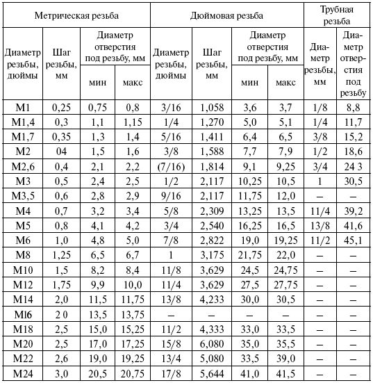 Диаметры отверстий под нарезание треугольных резьб