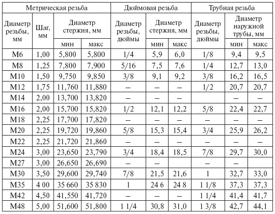 Диаметры стержней под нарезание треугольных резьб