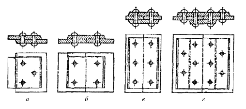 а – внахлестку; б – встык с одной накладкой; в – встык с двумя накладками, симметричные; г – встык с двумя накладками, несимметричные
