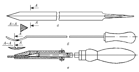 Различают ручные и механические шаберы. Они могут быть плоские односторонние и двухсторонние, цельные и со вставленными пластинками, трехгранные цельные и трехгранные односторонние, полукруглые односторонние и двухсторонние, ложкообразные и универсальные (рис. 32).