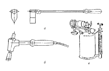 а – обычный, нагреваемый пламенем; б – электрический; в – паяльная лампа