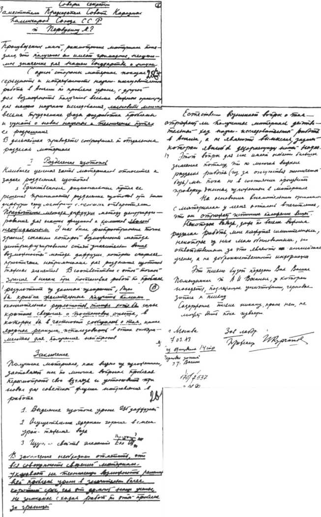 Письмо академика И.В. Курчатова, в котором он дает положительное заключение по материалам разведки