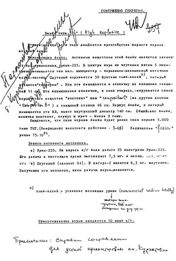 Представляется исключительно важным выяснить, изучалась ли указанная система расчетным или опытным путем? Если бы оказалось правильным второе предположение, это означало бы, что уже осуществлена атомная бомба и уран-235 выделен в больших количествах. В материале есть замечание, которое как будто говорит в пользу этого. При изложении метода «взрыва во внутрь» указывается, что еще не проводилось опытов с активным материалом, но что в ближайшие месяцы намечено выполнить такие опыты.