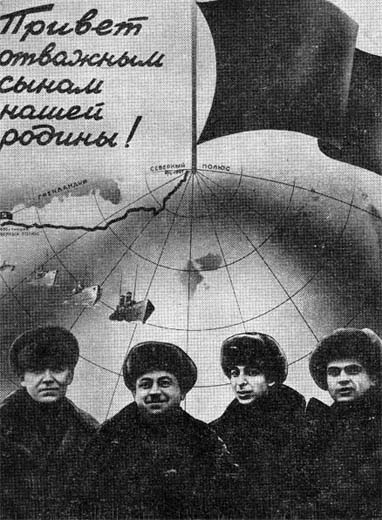 Покорители Северного полюса: Э. Т. Кренкель, И. Д. Папанин, Е. К. Федоров, П. П. Ширшов