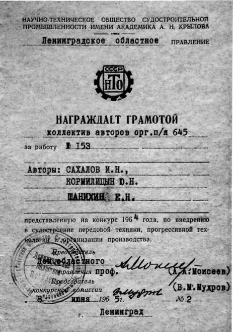 Та же общественность в ноябре 1963 г. обратилась к председателю Госкомитета с просьбой поощрить ряд сотрудников бюро за работу по теме «Наука», однако все ограничилось грамотой Ленинградского областного правления научно-технического общества судостроительной промышленности им. акад. АН.Крылова.