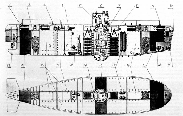 1 – погружной статический преобразователь; 2 – бункер с дробью; 3 – гидроакустически маяк-ответчик; 4 – насосный агрегат системы гидравлики; 5 – ограждение входного люка; 6 – входной люк; 7 – прочный корпус; 8 – контейнер аккумуляторной батареи; 9 – леерное ограждение; 10 – вспомогательное буксирное устройство; 11 – антенна гидролокатора кругового обзора; 12 – электропривод носовых поворотных колонок; 13 – носовая балластная цистерна; 14 – носовая цистерна быстрого погружения; 15 – баллонная выгородка; 16 – средняя балластная цистерна; 17 – прочный корпус; 18 – манипуляторное устройство; 19-кормовая цистерна маневрового бензина; 20 – цистерны плавучести; 21 – кормовая балластная цистерна; 22 – кормовая поворотная колонка